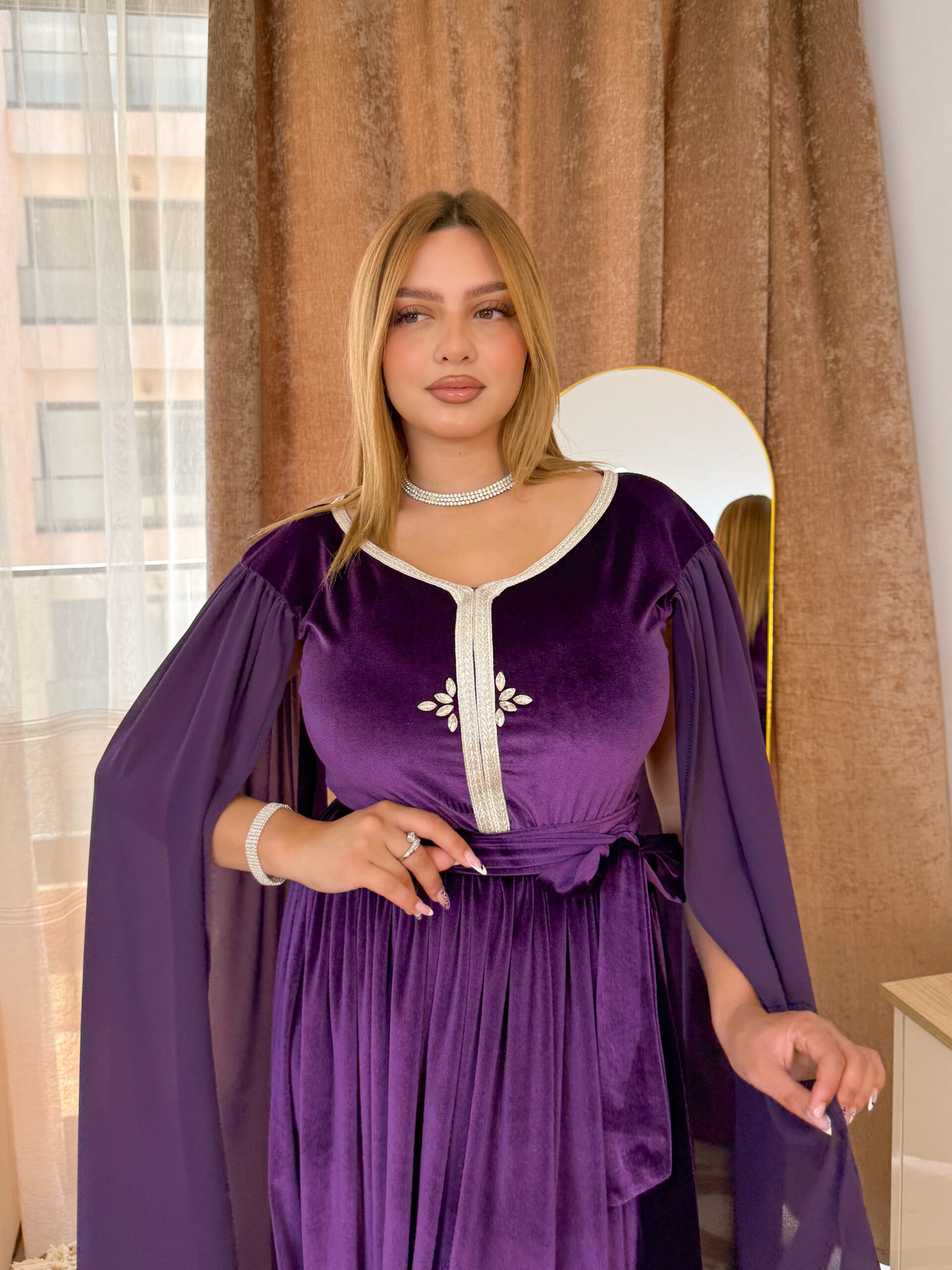 Rahaf une robe longue en velours , à la coupe fluide et élégante.