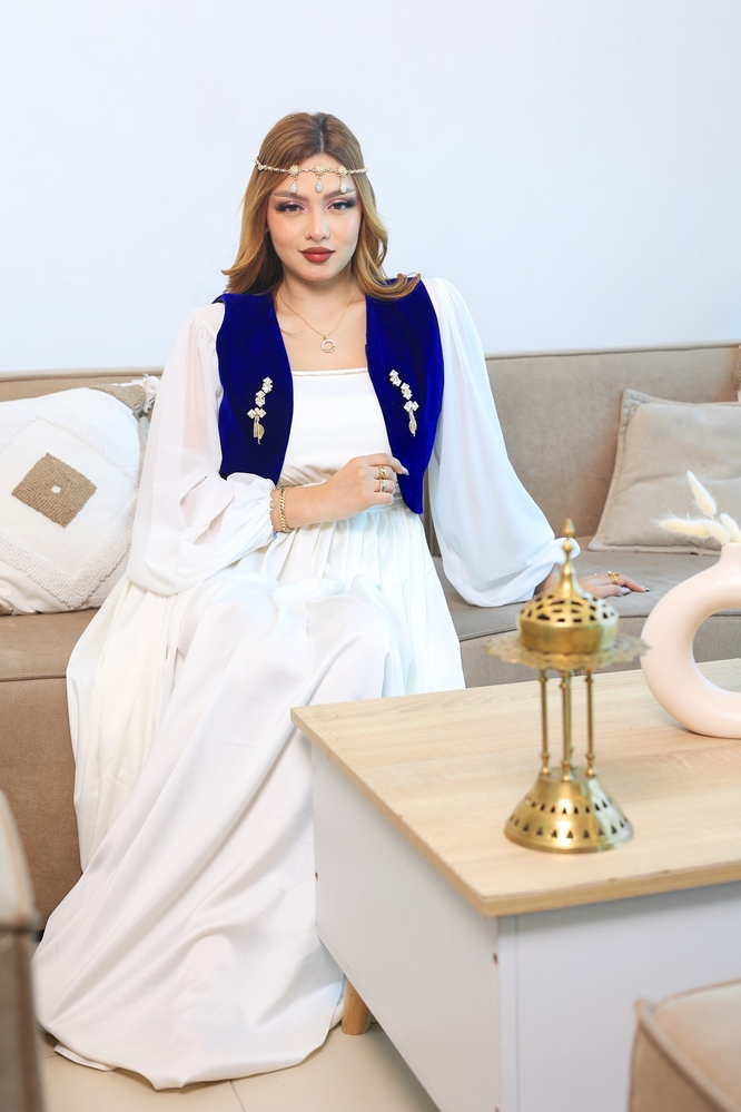 La robe sahar une tenue en deux piéces , une robe blanche avec son jilet bleu roi